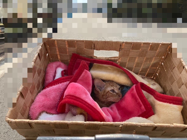 子猫は動物病院に毎日通院しています。動物病院のある場所は妻の通勤途中にあるため、通勤前に子猫を病院に預けて仕事の昼休に引き取るスケジュールで動きます。動物病院はとても親切な先生がおり、怪我をした野良猫を保護したと言うとこちらの仕事のスケジュールに合わせていただけたり等、とても助かりました。この写真は子猫を動物病院に連れて行くときのものです。動けないので、フタのない箱で問題ありませんでした!(妻も対応ありがとう!)