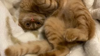 仕事から帰っておから部屋に入るとベッドの上でくるまっていました。近寄ってもごろごろ自分の尻尾をがぶがぶ珍しくしっぽ遊び、今日はしっぽが気になって仕方ないようです。しっぽ遊びに飽きると、その場でごろごろぐぐぐっと腕を伸ばして最後はばんざーいで...