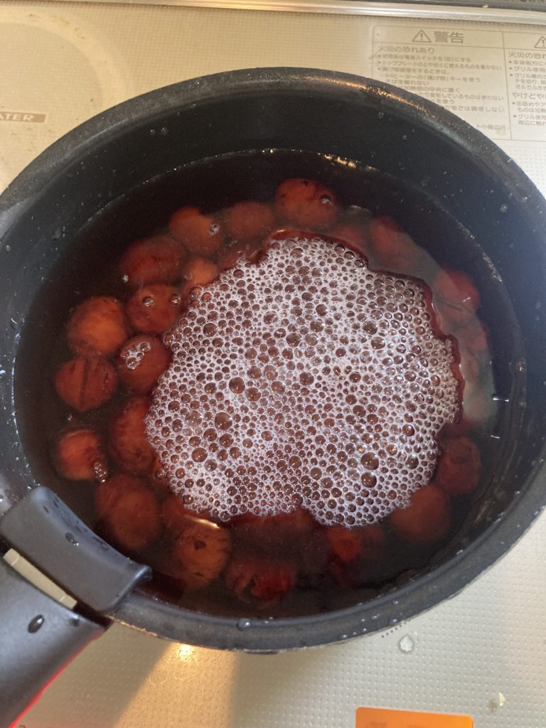 茹で汁は捨てて栗が浸かる程度の水で煮詰めていきます。