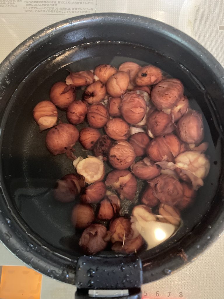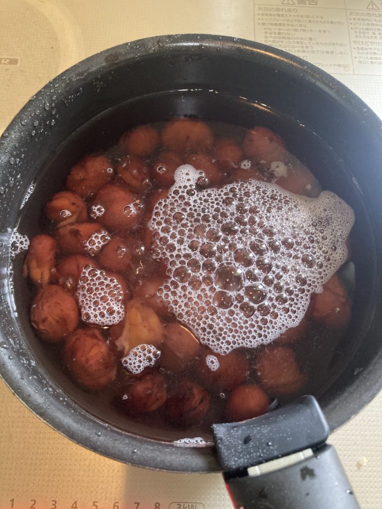 剥いた栗はアクを取っていきます。
