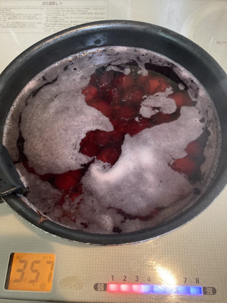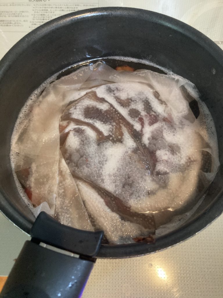 沸騰したら弱火にし、砂糖を何回か加えて落とし蓋をし20分煮詰める